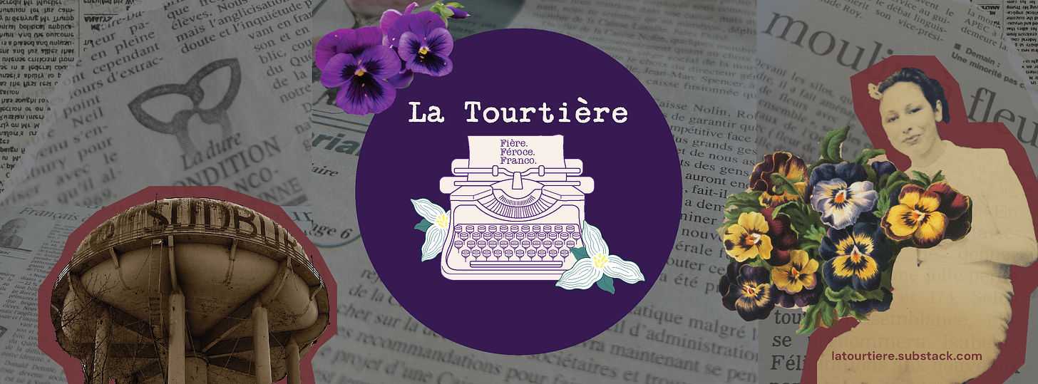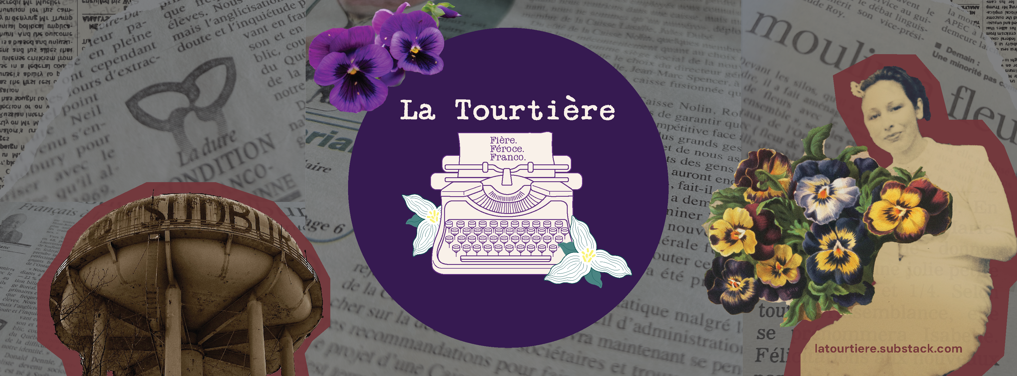 The nod to Sudbury, the city of my birth, through its old Pine Street water tower, taken one autumn day during a Sudbury escapade with an old amoureux. The scraps of paper from La Presse and Le Voyageur, which illustrate “la dure condition franco-ontarienne.” The typewriter, the trillium, the tagline.