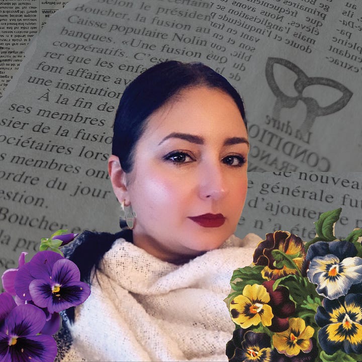 Cette femme dont le nom et la recette de tourtière je revendique comme un legs. Ma grand-mère maternelle. Isabelle. Dans toute sa splendeur de jeunesse, prenant le thé en forêt à Cartier, ici, dans le Nord de l’Ontario, entourée de ses fleurs préférées : des pensées, cette verdure qui résiste au froid.